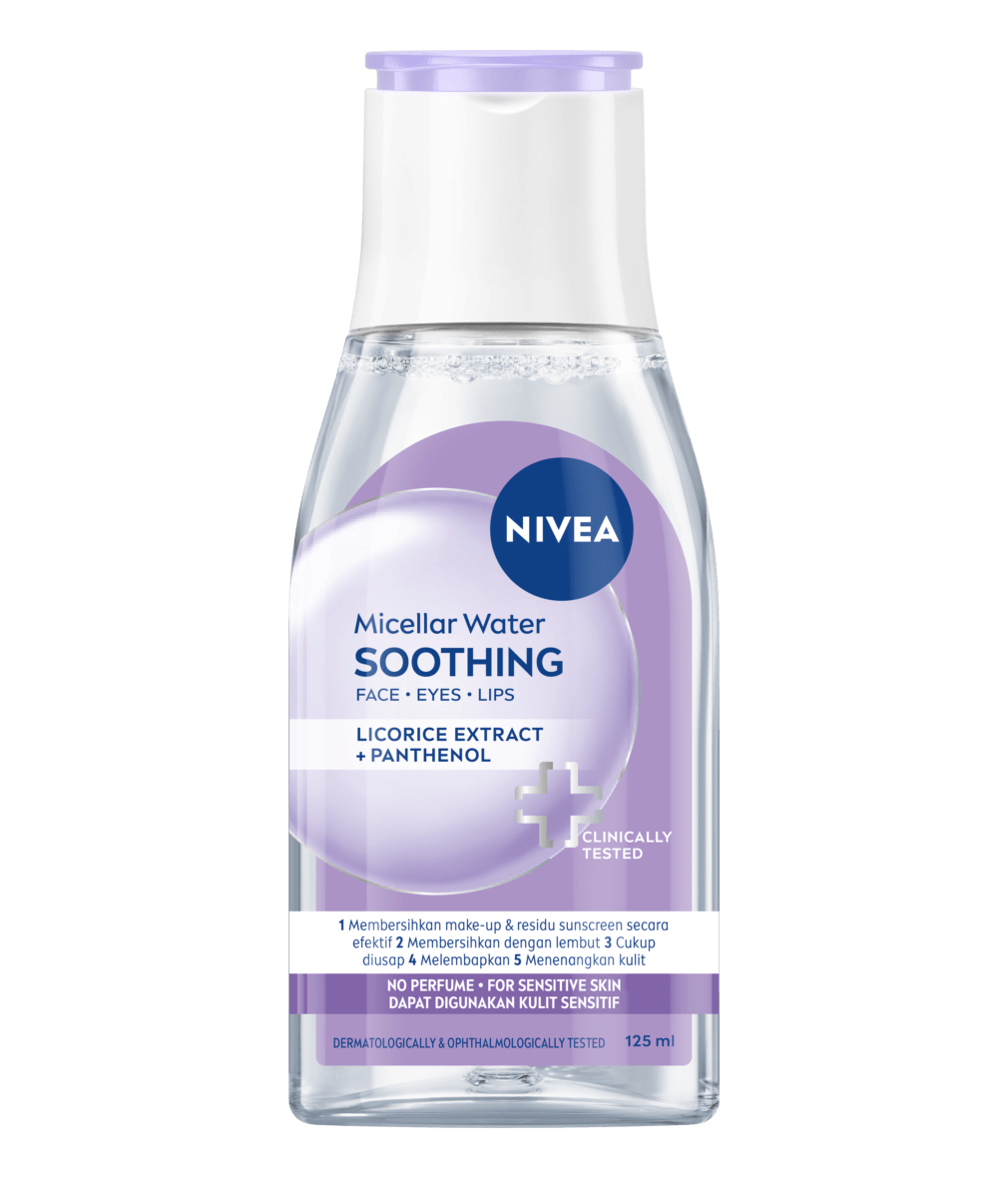 NIVEA Soothing Micellar Water dengan kandungan Licorice Extract, Panthenol, & Amino Acid Complex dapat membersihkan kotoran, sisa make-up & residu sunscreen secara efektif 100% serta mengurangi iritasi akibat kulit kering dalam 2 jam.